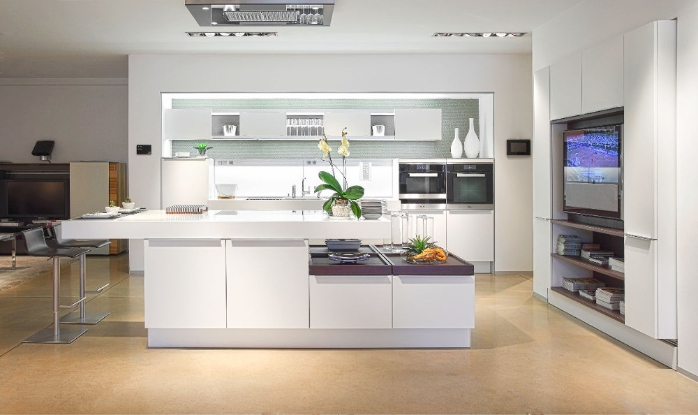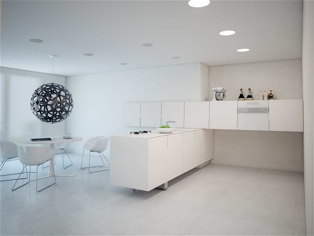 On first appearance, this may well look like another contemporary kitchen…after a while, many a design can end up looking remarkably similar. There is a difference here though, this one looks like it actually looks and represents how the user may use the kitchen. Take note of the rather large television, and the chairs pointing directly at them. In terms of the kitchen itself, a rather nice modular design with interesting use of height to break up the structure, and give the appearance of more space. The back lighting is excellent too, adding additional drama and a premium feel.
