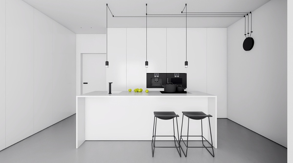 As far as functional kitchens go, this is an absolute dream. Often we find images of kitchens that are designed to be showpieces, pure eye candy…then we get kitchens that not only look absolutely stunning, but are actually fully functioning, usable spaces. The balance in this white kitchen is tremendous. Plenty of open space, plenty of counter work space, the sink, hob and fridge triangle is in place…just a well designed space. I especially like the white and grey kitchen balance, it breaks up the space in a very aesthetic way.