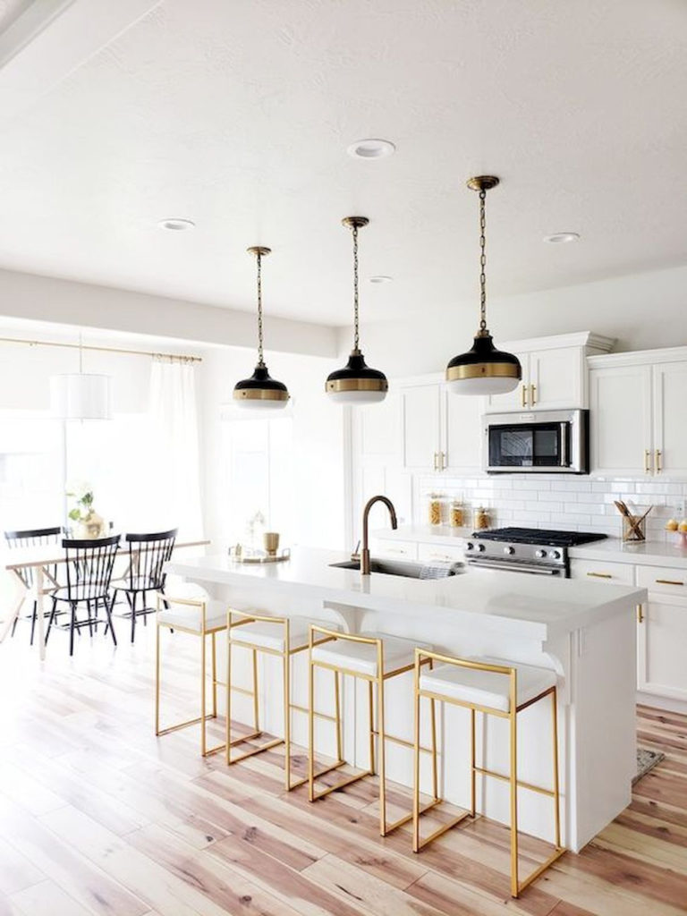This white kitchen looks absolutely stunning, but if you look carefully, you may well be a little surprised. It is the accessories that really make this kitchen. The most obvious, being the glorious gold chairs that deliver so much drama. They are matched with gold handles on the kitchen cabinets. This adds consistency to the design. Add in a very premium countertop and you have the makings of white kitchen greatness. All this magnificence, constructed on what appears to be a pretty standard, traditional kitchen cabinets. I may well be doing a disservice to the owners, but if it is the case, this is incredible clever design work.