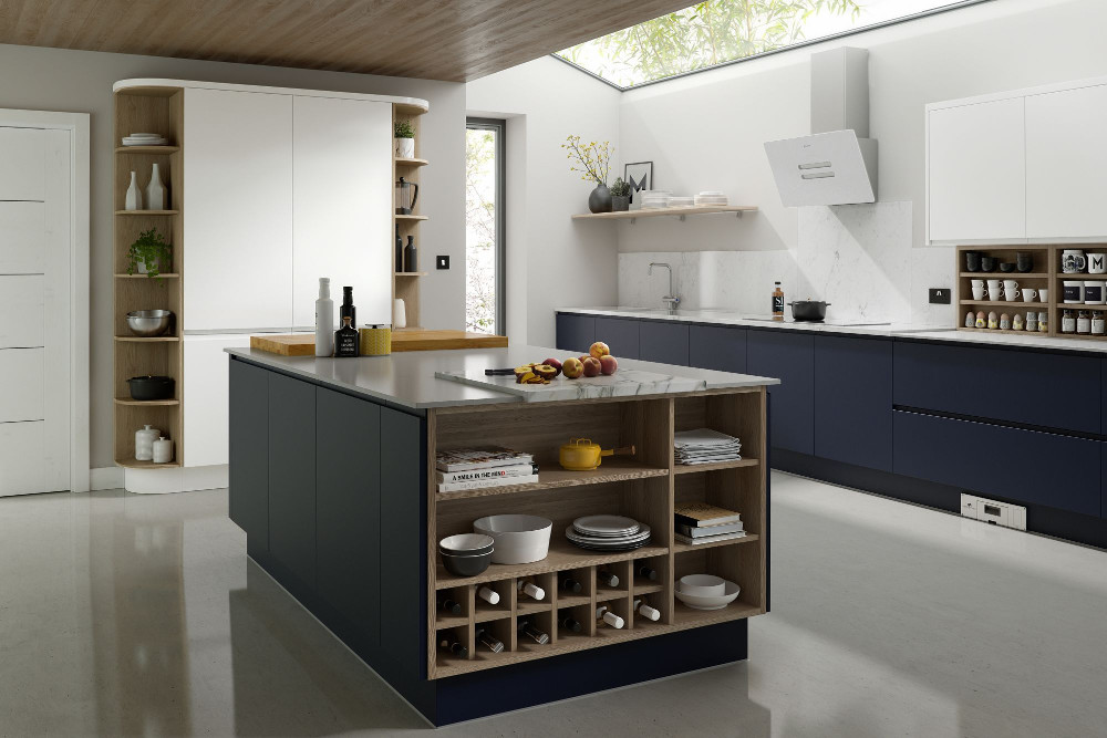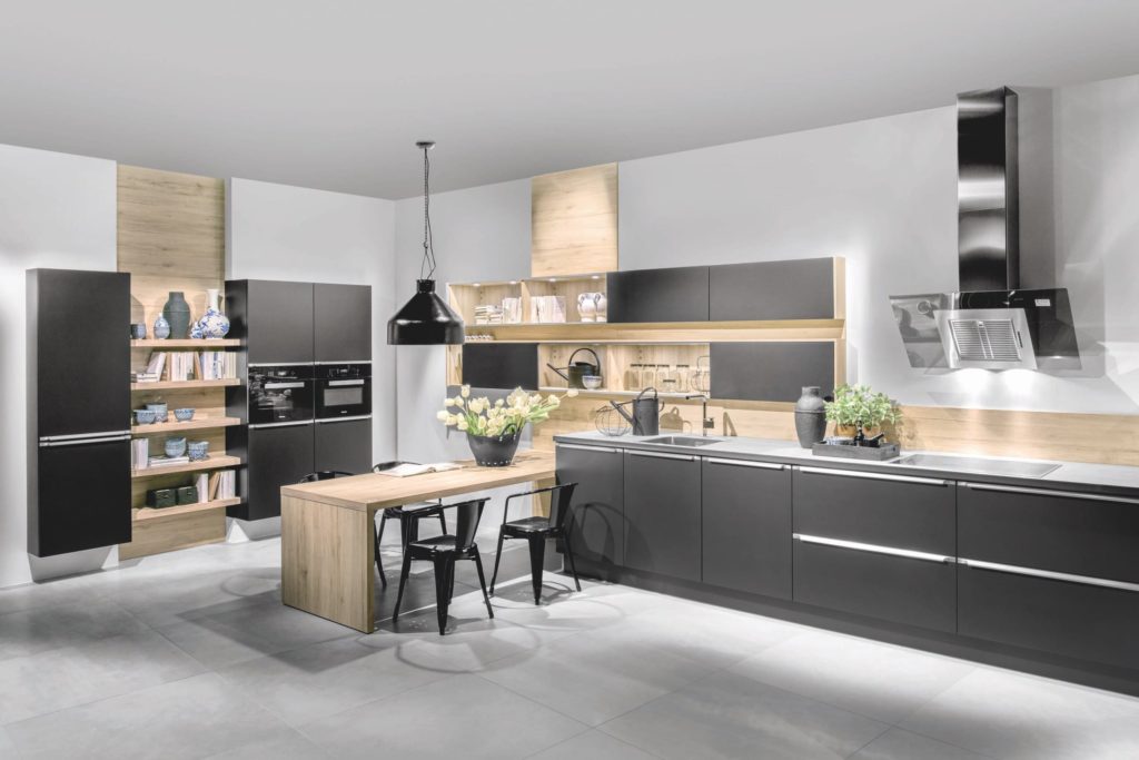 An excellent example of a black kitchen with different levels. The use of white adds space, while the oak adds a softer, premium touch.