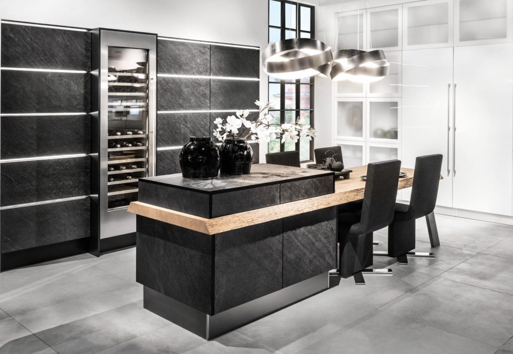 I very much appreciate how this kitchen makes a great effort to integrate the table into the business end of the kitchen. For any guests that happen to sit there, they are part of the process which makes it a great entertainment space. The black kitchen cabinets have a chrome strip running across the top, and they complement the natural oak colour perfectly. A great example of a modern black kitchen in a functional setting.