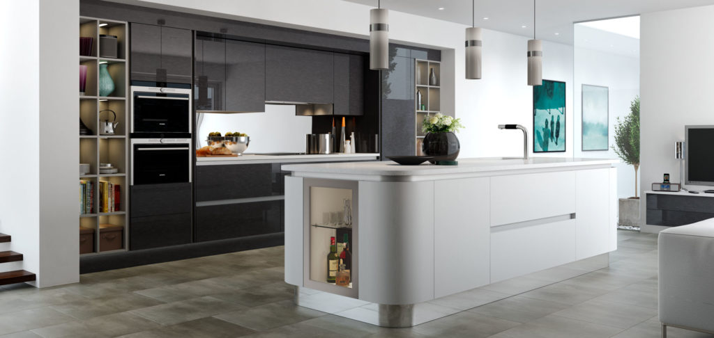 A lovely gloss black kitchen that ticks all the boxes, It is neat and tidy, without overly dominating. The advantages of gloss finishes are clear here, the way it reflects light back into the kitchen is great. The dark cabinets add plenty of style…but a questionable amount of cooking space.