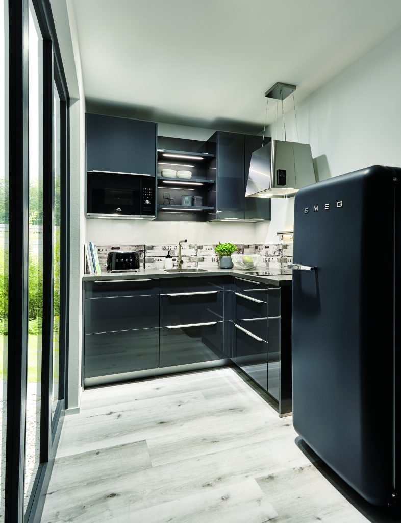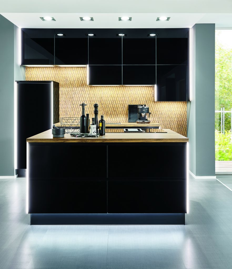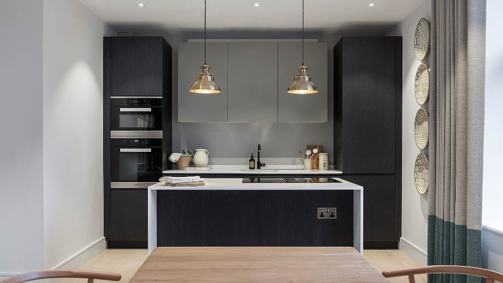 A deceptively large kitchen, the majority of the storage is hidden in the white walls. It gives an appearance that this kitchen is on a single level. The way the kitchen delivers shape and the lighting, make this a stand out black kitchen inspiration.