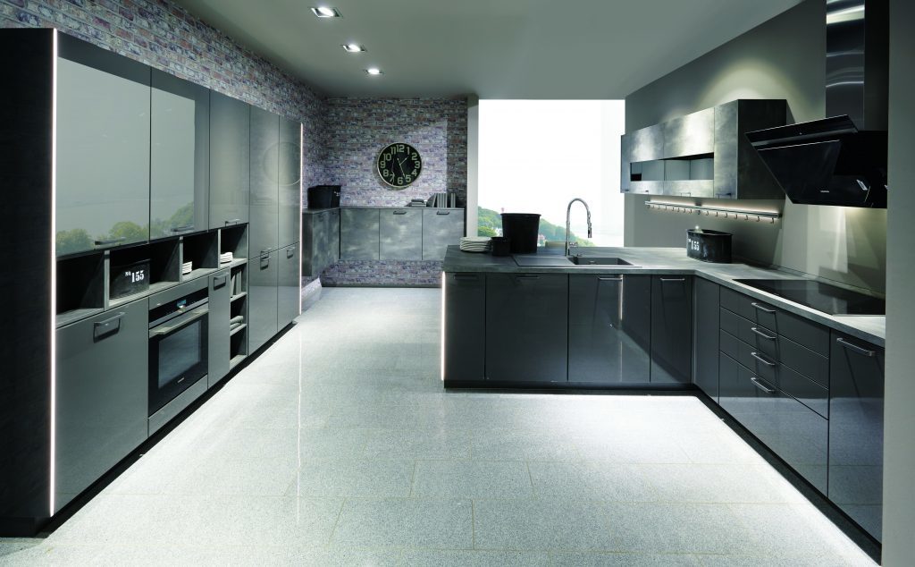 A great example of how you can fit a small kitchen in a very small area, whilst maximizing the space available. This black kitchen with grey cabinets, does this very well. The kitchen island works wonderfully well here, most would suspect that it would be too imposing. Definitely not the case here.