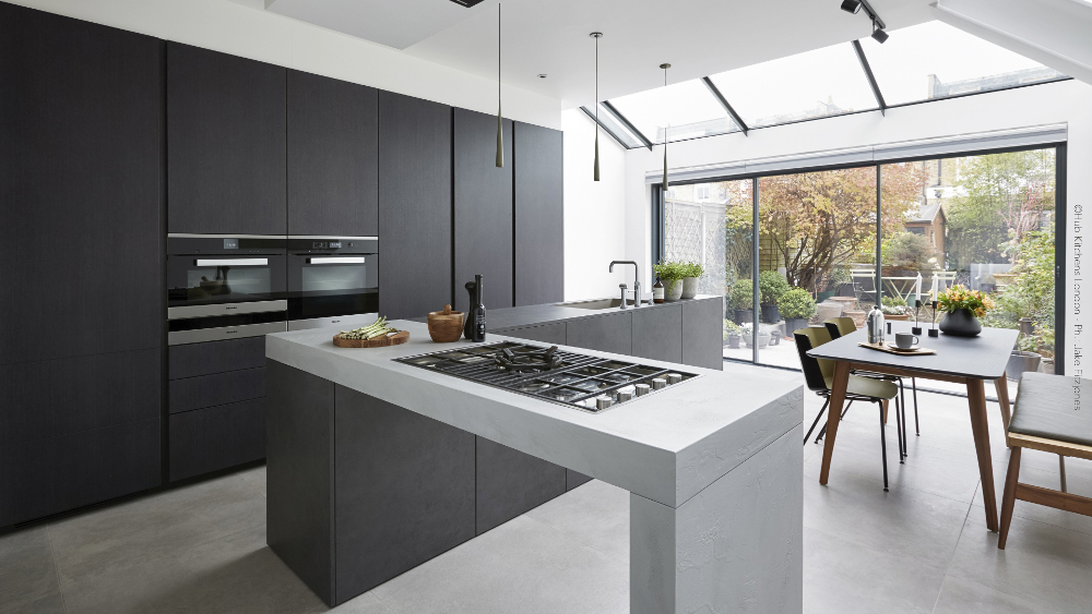 Gorgeous is the word here, the way the kitchen integrates so well with the garden, is design genius. The sheer amount of light penetrating those huge windows, mean that a fully black kitchen is plausible here.